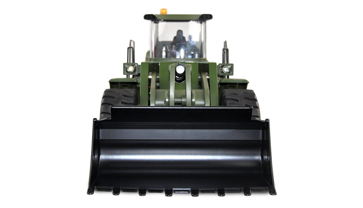 The exclusive G485E ME Military wheel loader in 1:14 scale impresses visually with its special paint in NATO olive green and the switchable beacon light. Thanks to improved electronics, this construction machine meets a wide range of requirements - moreover, a self-built quick coupler and a pallet fork are each included in the delivery scope made of metal. Therefore, there are hardly any limits to the variety of applications.